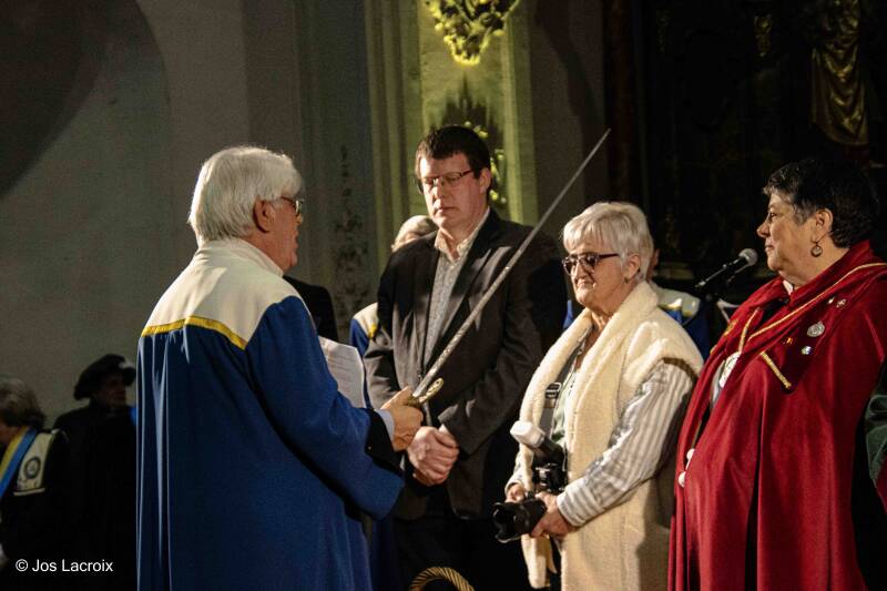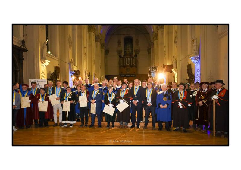 Lint: geel-blauw 10 cm breed, gedragen op de rechterschouder, met Rosace en gouden ereteken